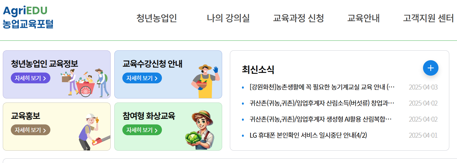 - 메인 화면에서 '2025년 공익직불제자인 교육' 강의를 검색하거나 공지사항에서 해당 강의를 선택합니다.