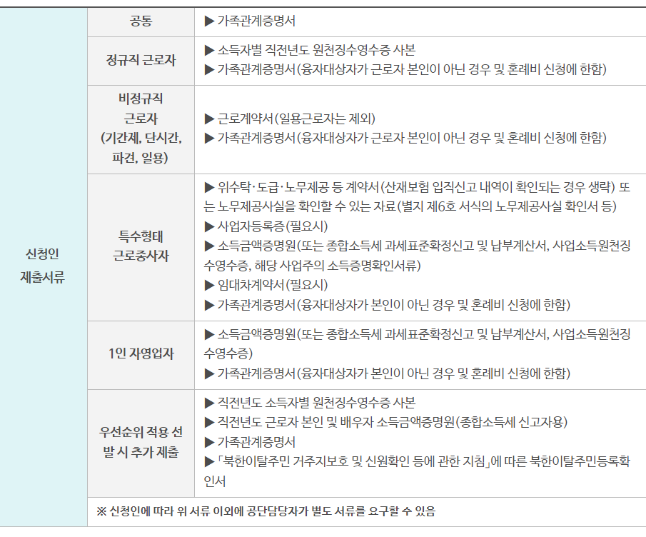 기본적으로 가족관계증명서가 필요, 일반적인 4대 가입되는 직장일 경우 소득이 확인 가능한 직전년도 원천징수영수증 사본이 필요, 비정규직인 기간제, 단기, 파견, 일용직일 경우 근로계약서가 필요.