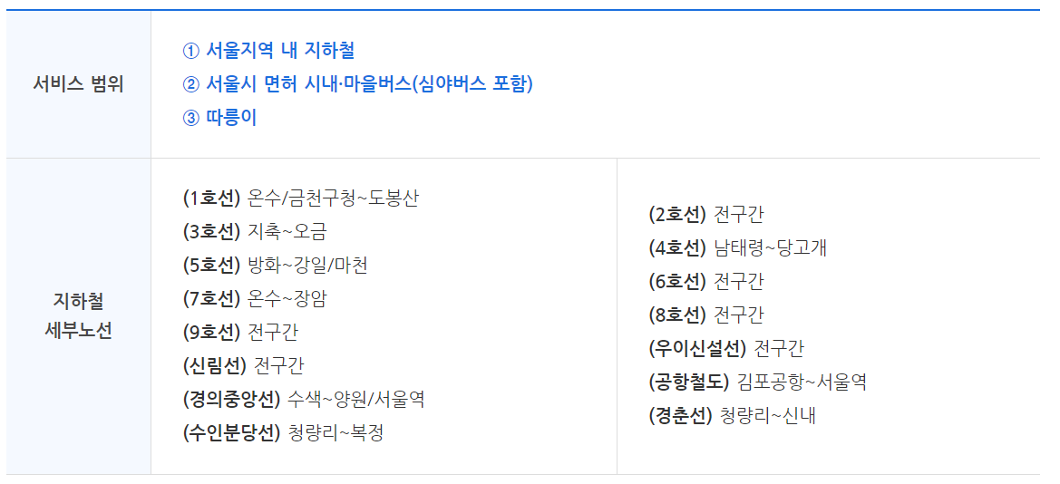 이용범위 : 서울지역 지하철, 서울시 면허 시내.마을버스, 따릉이