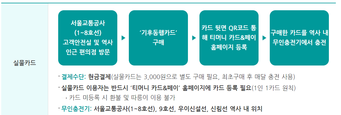 - 결제수단 : 현금결제 (실물카드는 3,000원으로 별도 구매 필요, 최초 구매 후 매달 충전 사용)
