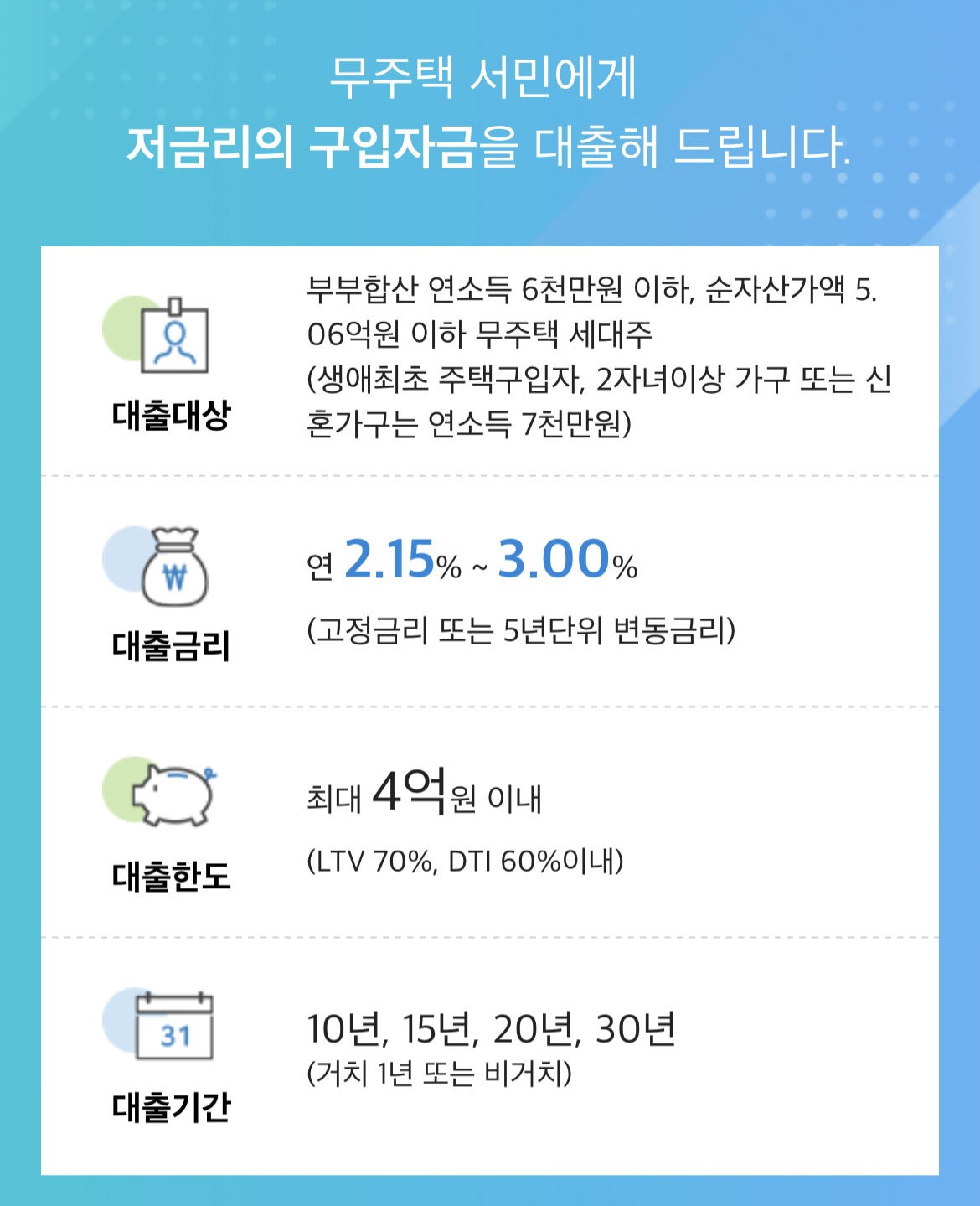 요즘 금리가 언제까지 이어질지 알 수 없는 상황입니다. 그리고 집값이 하락세라 언제가 바닥이 될지도 모르는 상황이고 금리는 계속 올라가는 추세이죠. 올해도 새해 목표로 내 집 마련을 꿈꾸는 분들이 많으실 텐데요. 내 집 마련을 고려 중이라면 정부 지원 저금리 주택 구입 자금 대출을 먼저 알아봐야 하겠습니다.