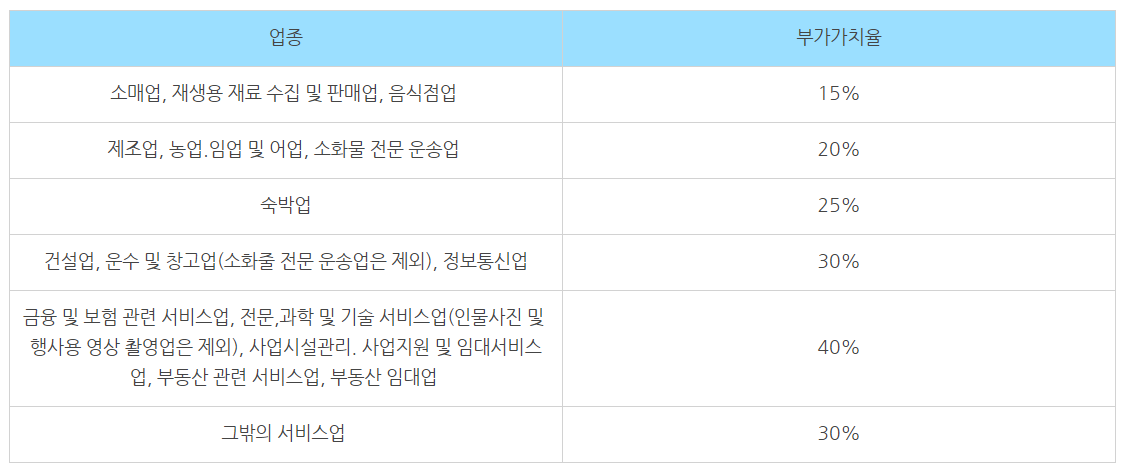 | 간이과세자 : 1년간의 매출액 8천만 원 미만인 경우 : (매출액 X 업종별부가가치율X10%) - 공제세액 :납부세액 |