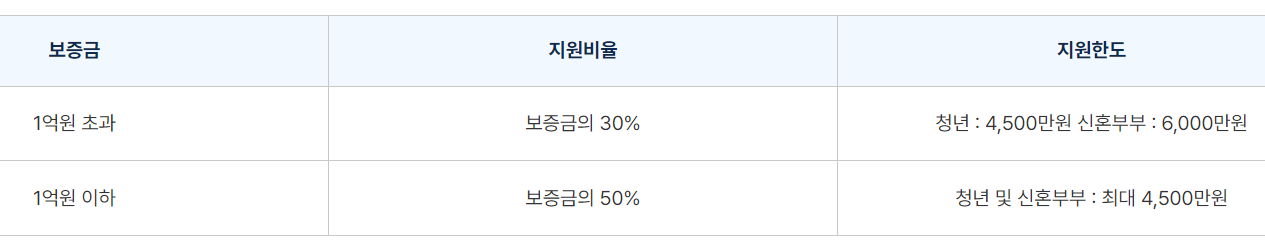 - 지원내용 : 보증금 1억원 초과 시 보증금의 30% 지원 / 보증금 1억원 이하 시 보증금의 50% 지원