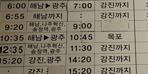 광주종합버스터미널 | 매시간 정각 출발 ( 약2시간 소요) |