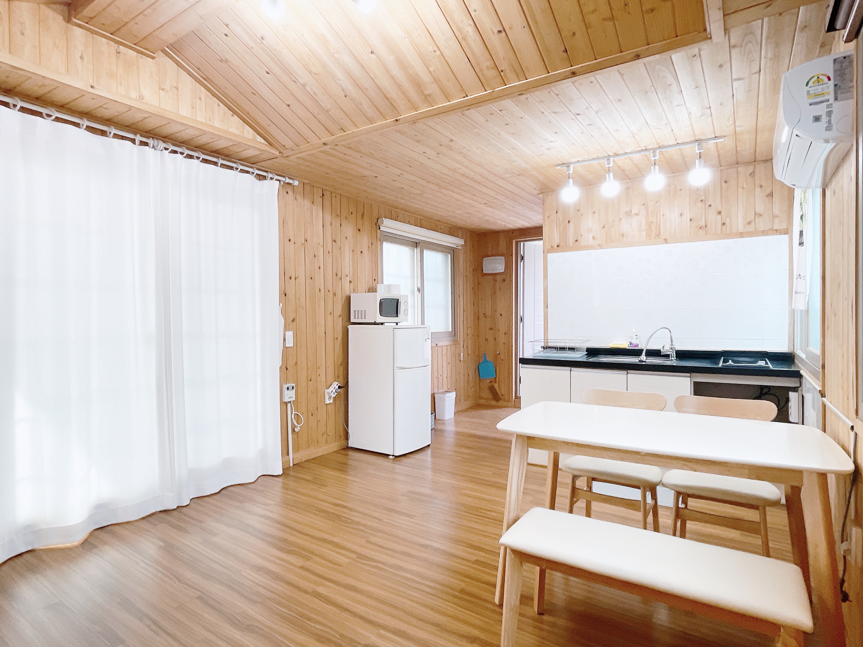 부엌에는 전자레인지, 밥솥등 기본식기류(수저, 젖가락, 그릇, 접시, 머그컵)등이 갖춰져 있어 간단한 조리가 가능합니다. 독채라는 장점답게 다른사람 눈치 안보고 소음 걱정없이 편하게 쉬어갈 수 있습니다.