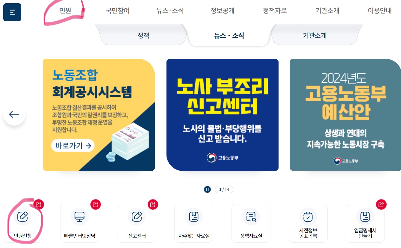 고용노동부 홈페이지에 접속하여 민원마당에 민원신청을 클릭합니다.