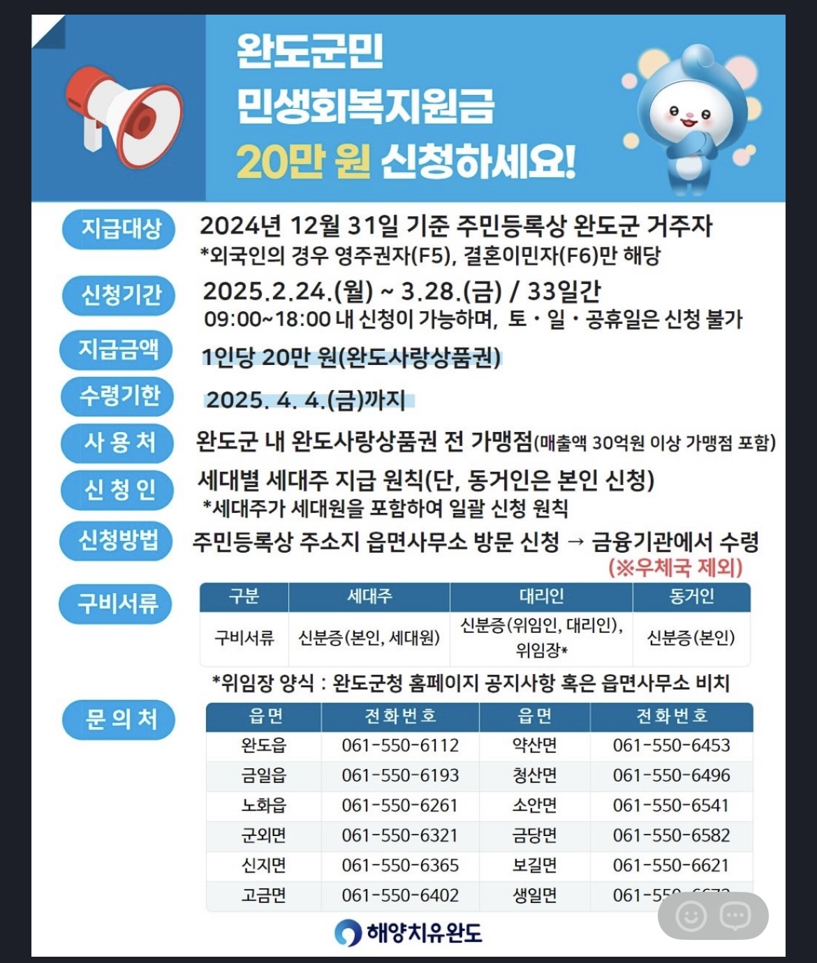 신청 대상, 신청 방법, 지급 일정, 사용처 등을 자세히 정리하였으니, 완도군민이라면 놓치지 말고 신청하세요!