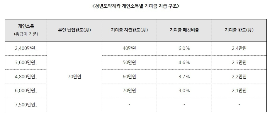 2. 개인소득 6000만원 이하 청년은 정부 기여금 지급.비과세를 적용 받을 수 있습니다.