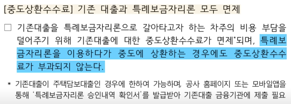 기존에 주택담보대출이 있으신 분들이 특례보금자리론을 신청하면 중도상환수수료가 면제 되고, 특례보금자리론을 중도상환하더라도 중도상환수수료가 면제됩니다.