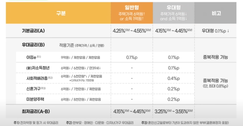 ○ 우대형 : 주택가격 6억원 이하 연 소득 기준 1억원 이하로 일반형조다 0.1% 금리우대