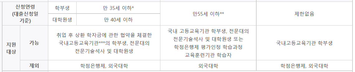 신청 가능한 나이는 대출 신청일 기준으로 만 35세이하, 만 45세 이하의 전문대학교(학과 채용조건에 상이할 수 있음) 에 입학 또는 재학 중인 학생은 취업 후 상환 가능한 학자금 대출을 신청 할 수 있습니다.