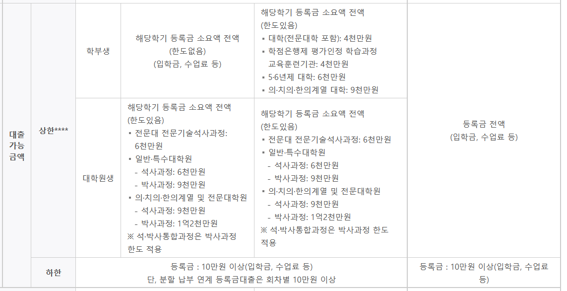 취업후 상환 학자금 대출의 경우 학부생은 제한이 없고 대학원생은 석사 6천만원, 박사 9천만원까지 대출이 가능합니다.