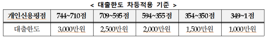 대출한도 : 3천만원(신용평점 구간별 한도 차등)