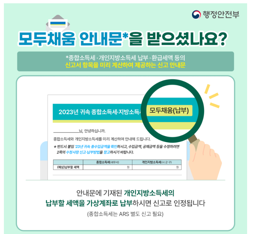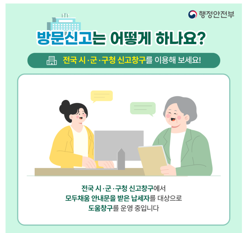 ● 모두채움 안내문 상 납부세액에 수정사항이 있다면 홈택스(손택스) 위택스 연계신고하거나 전국 시.군.구청 신고창구를 방문해보세요.