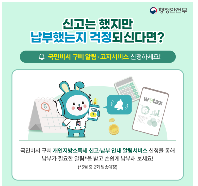 저도 신고를 했는데 납부했는지 가끔 걱정이 되는 부분들이 있습니다. 이럴때는 국민비서 구삐 알림.고지서비스 신청을 통해 납부가 필요한 알림을 받고 손쉽게 납부하시면 됩니다.